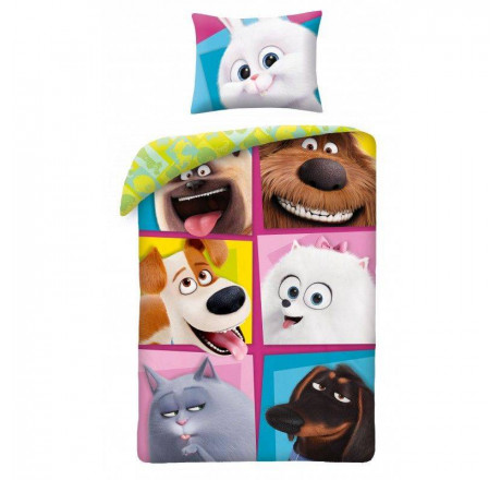 Bavlnené obliečky na veľkú posteľ zdobia na prednej strane portréty psíkov, mačky a králika z rozprávky tajný život maznáčikov. Na rubovej strane návliečky je zeleno modrý podklad. Na vankúši je z oboch strán rovnaký obrázok.