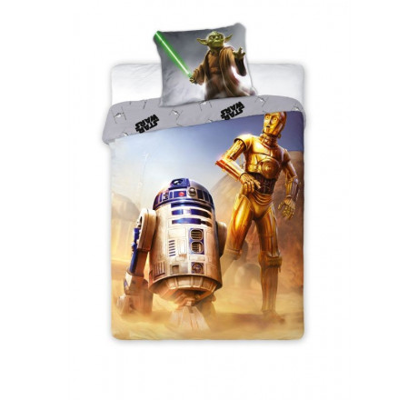 Bavlnené obliečky na veľkú posteľ zdobia na prednej strane planet, kterú preskúmavajú R2-D2 a CP3O. Na rubovej strane návliečky je sivý podklad s nápismi. Na vankúši je z oboch strán rovnaký obrázok Yody.