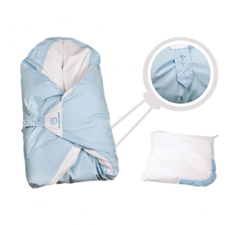 Táto obliečka na zavinovačku je ušitá z dvoch druhoch bavlny. Z jednej strany je biele bavlnené plátno a z vnútornej strany modré plátno s bielou bodkou.